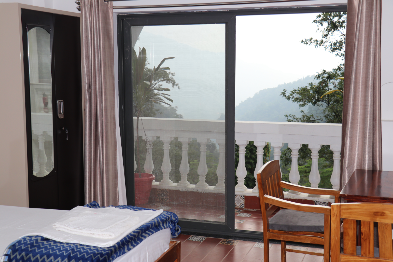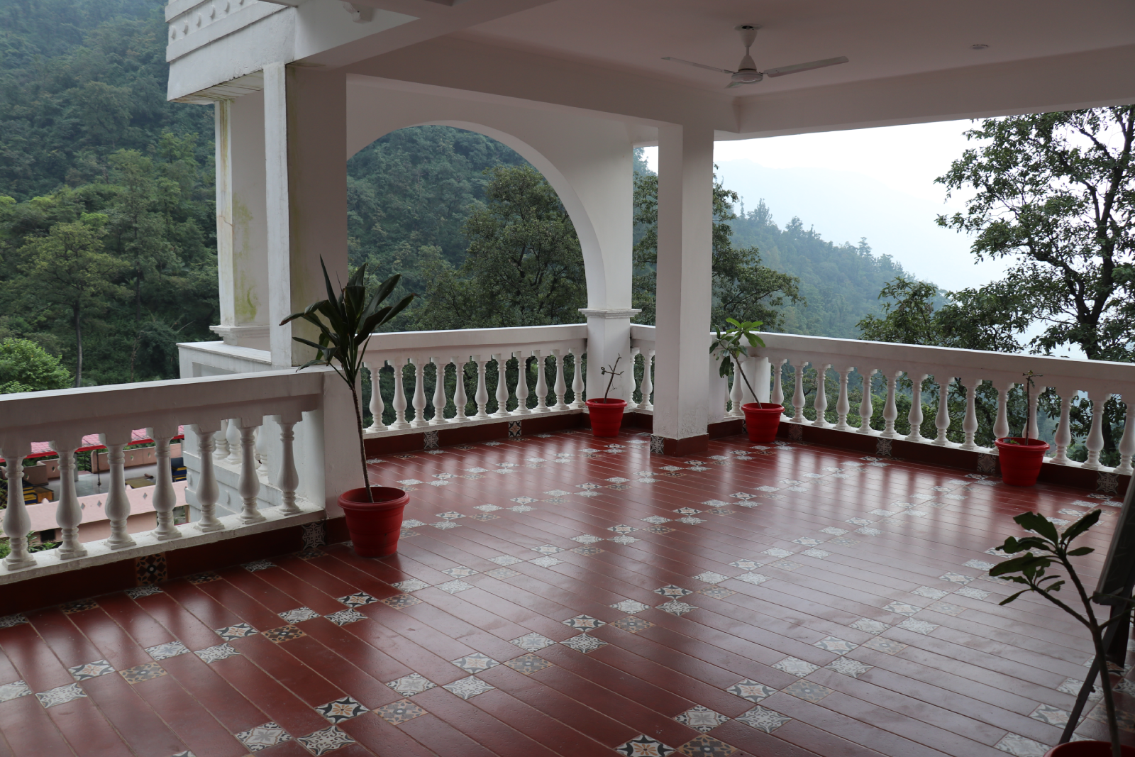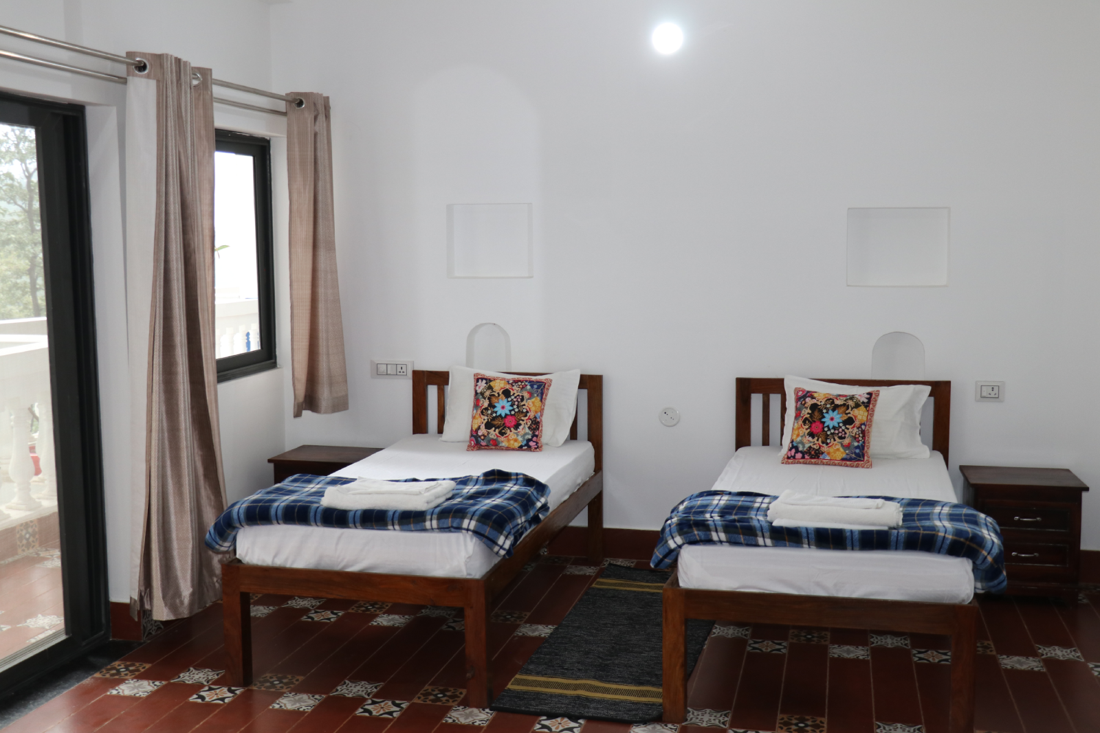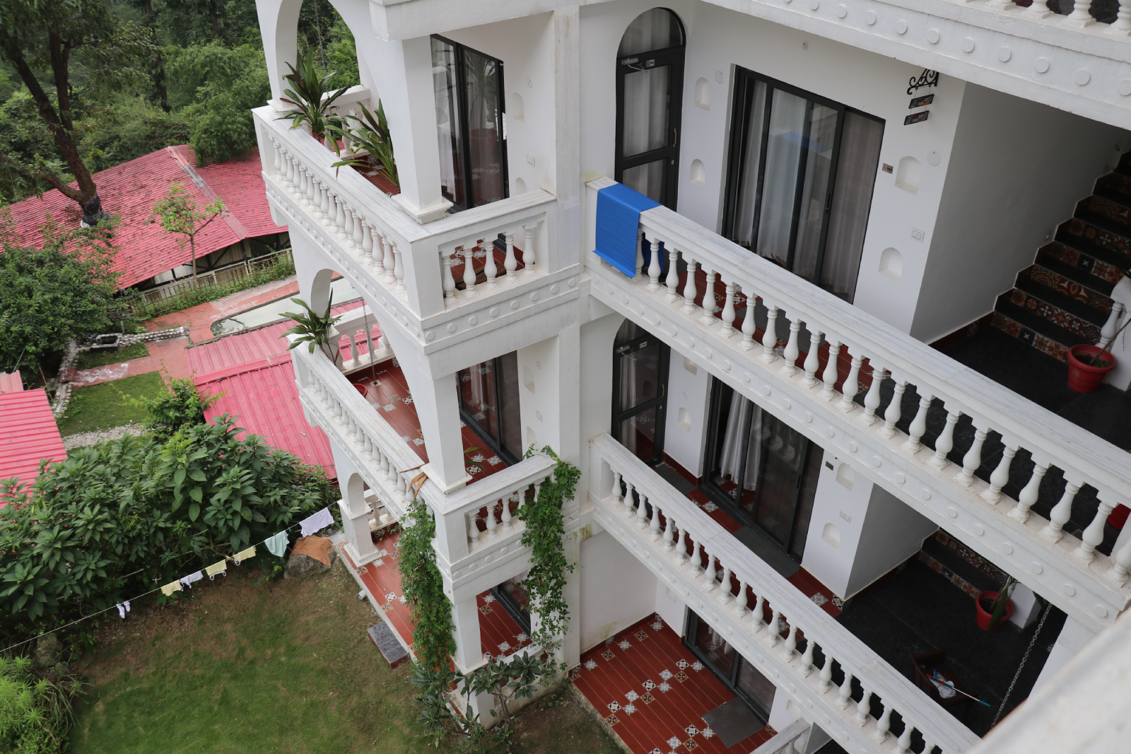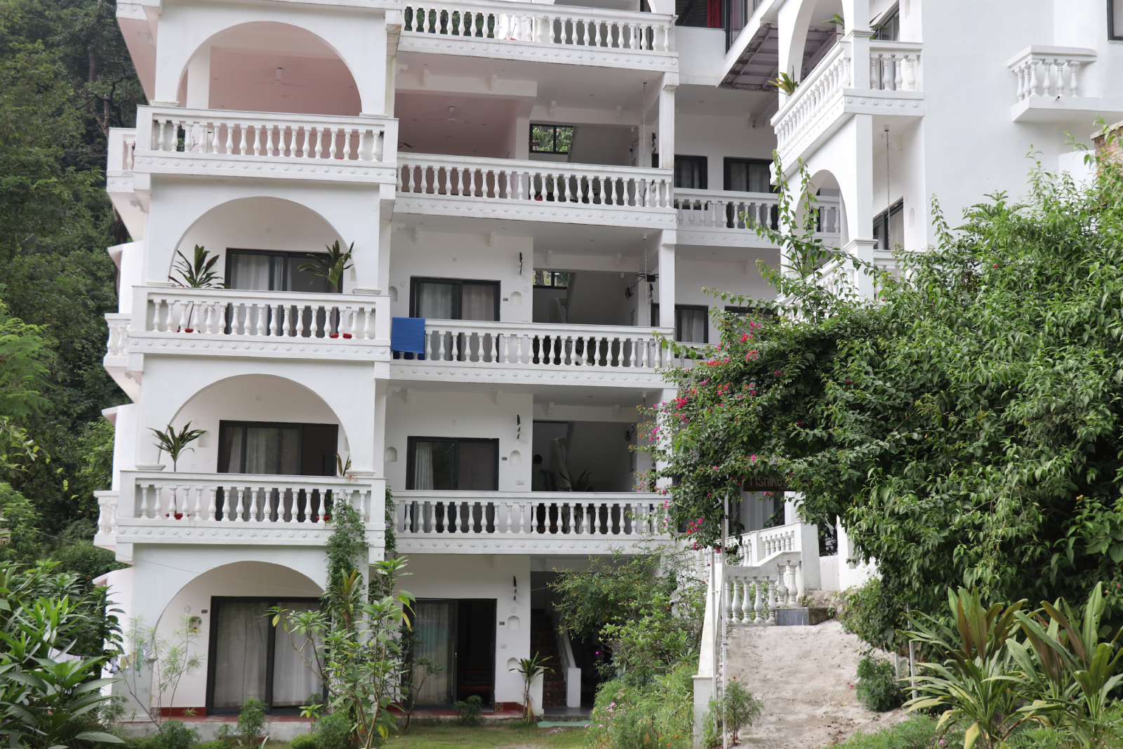 The second site is a newly built four-story residence with twelve apartments, each with two bedrooms and a shared bathroom, and two rooftop yoga spaces overlooking majestic Himalayan views.